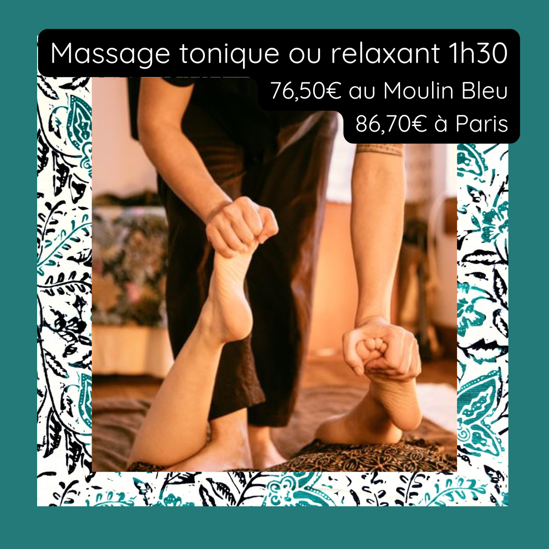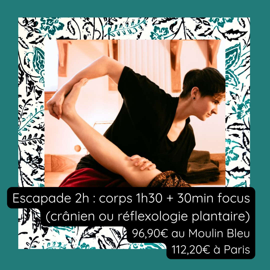 - Valables uniquement à l’espace détente du Moulin Bleu à St Jean Froidmentel (41) ou au cabinet rue du Rhin à Paris (75019).