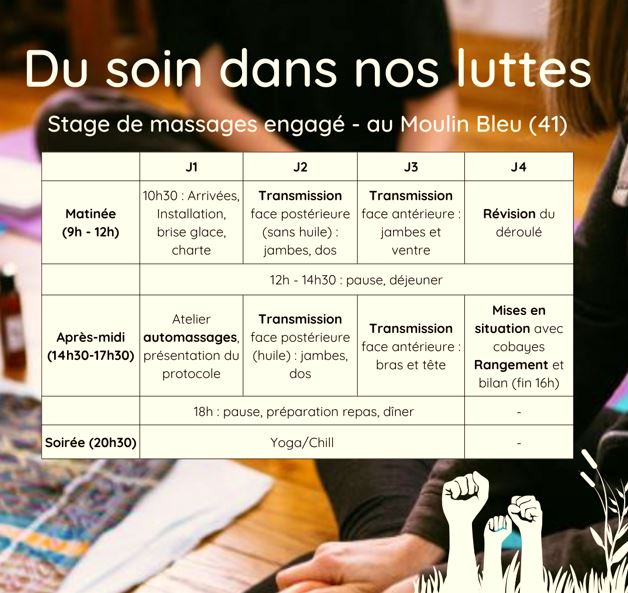 Depuis 2023, les stages « du soin dans nos luttes » et les weekend de ressourcement « River Body » visent à enseigner des techniques de massage de bien-être, dans un esprit plus accessible (humainement et financièrement) et plus critique qu’une formation de massage classique destinée au marché capitaliste, sans sacrifier le professionnalisme.